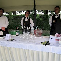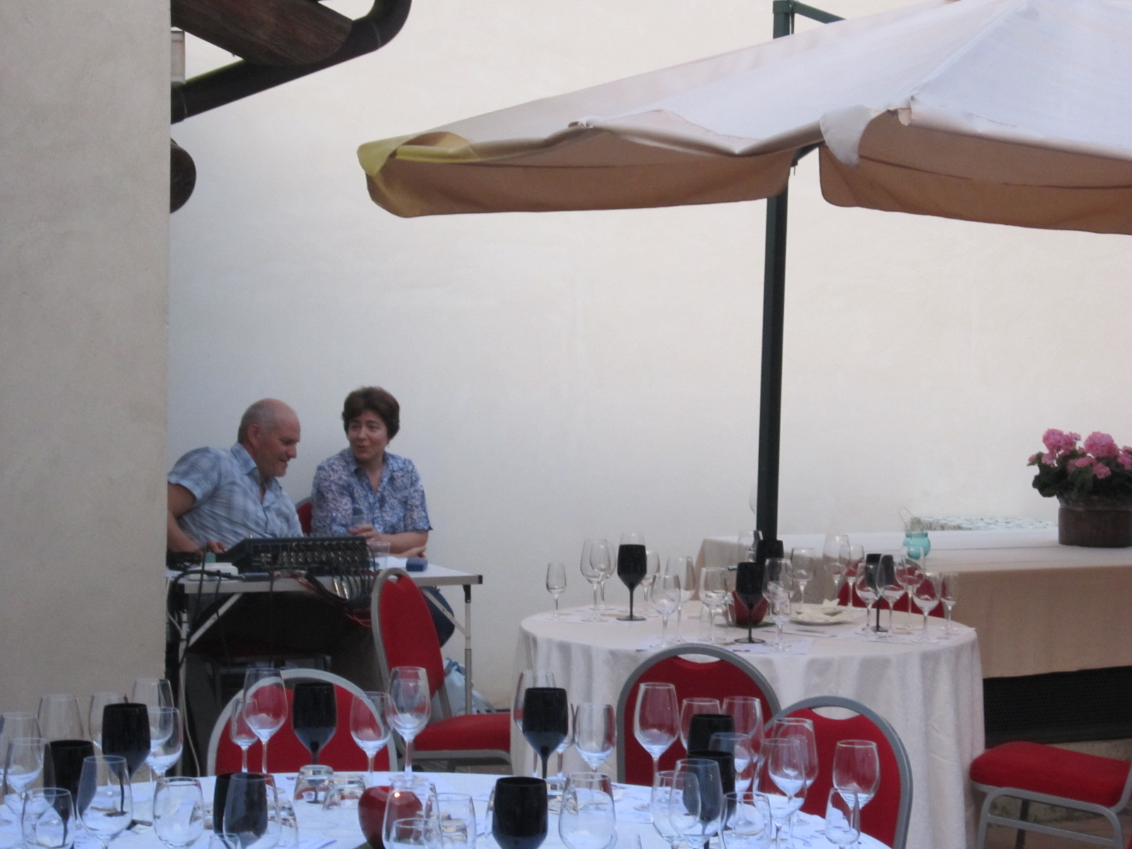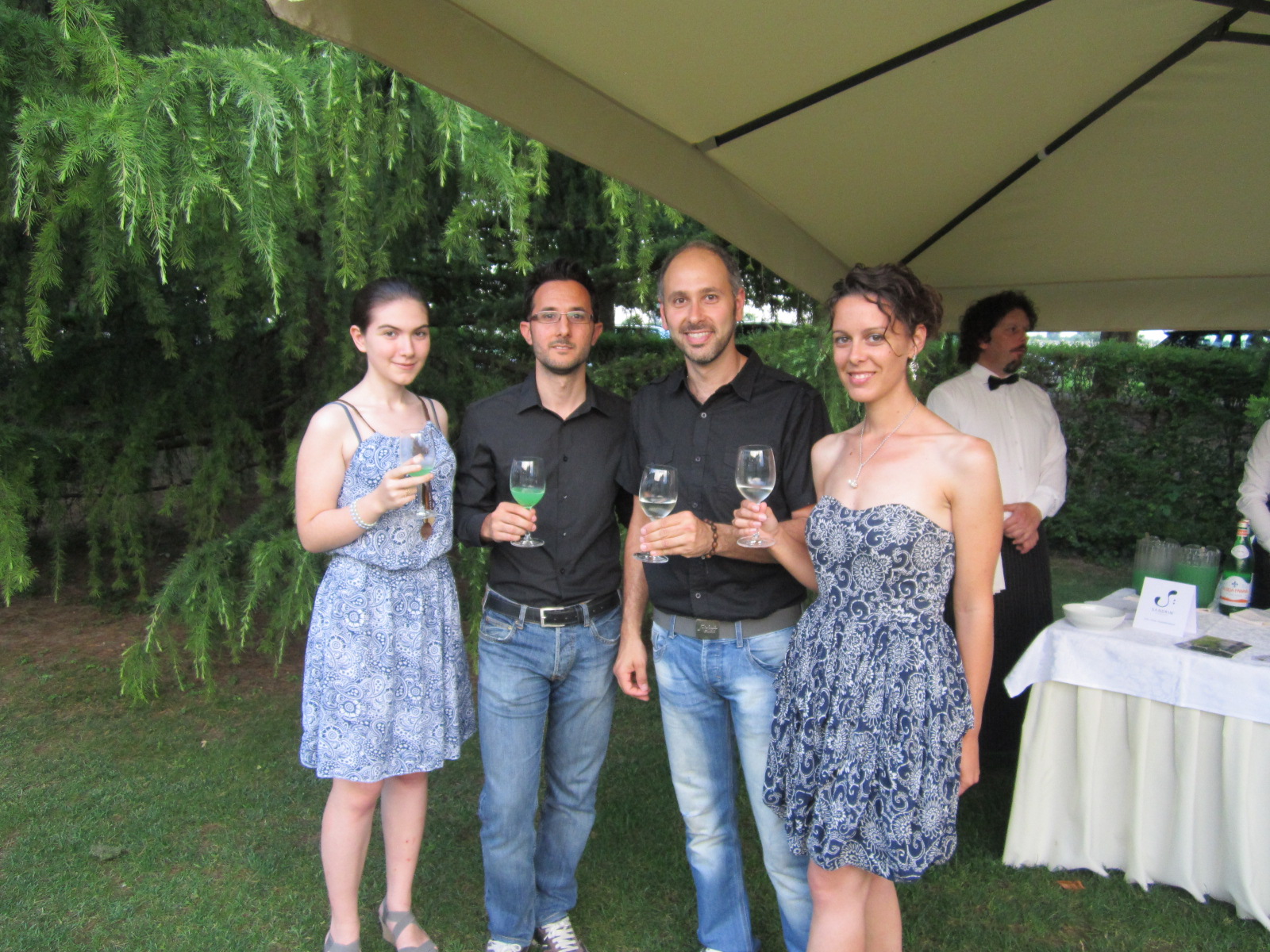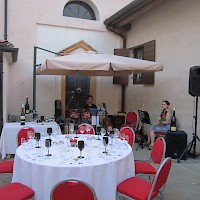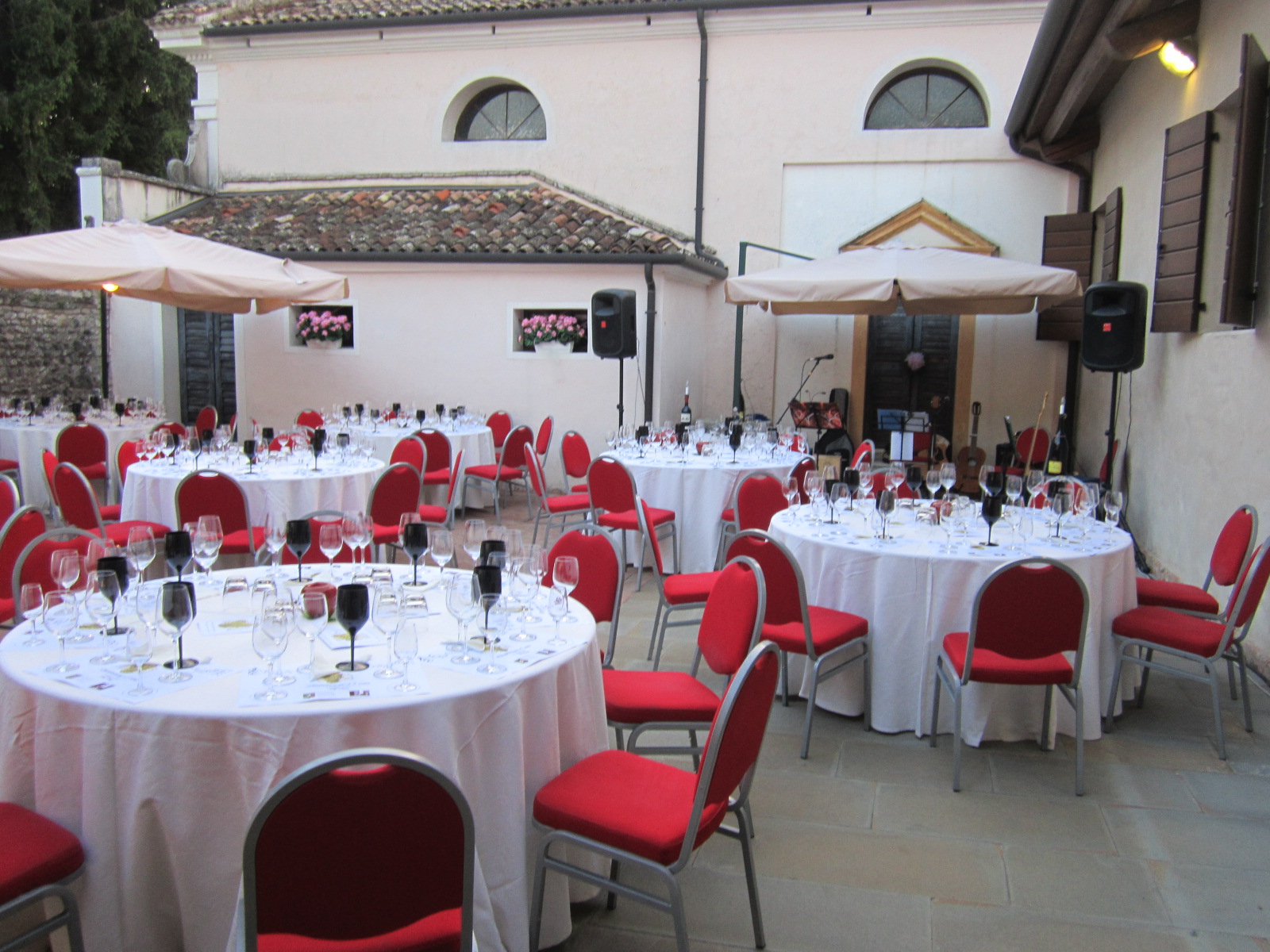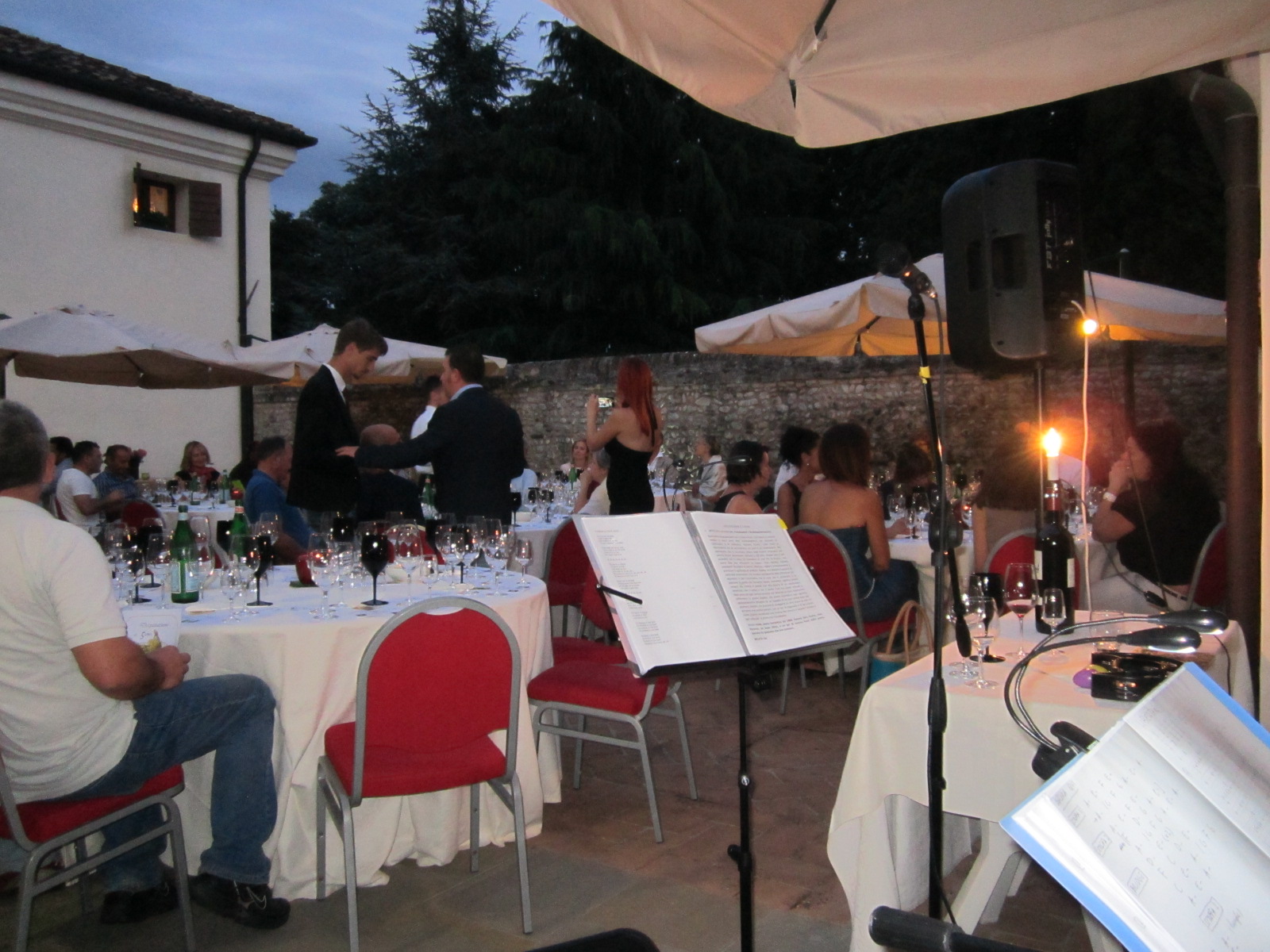 Appena entriamo nel parco lo capiamo subito che questa sarà una serata speciale, a dir poco magica. Il palcoscenico è un piccolo chiostro racchiuso nel cuore di Villa Dirce, un angolo di intimità per raccontare i vini del nostro territorio. All’inizio il nome aveva un ché di misterioso e oscuro, Borgo Malanotte, ma niente è più luminoso dell’incontro tra un verde prato e un tramonto d’estate. Tavoli drappati da lunghe tovaglie color avorio, e comodi divani distribuiti sull’erba. Il caldo intenso di questo luglio infuocato si stempera a poco a poco, affoga da subito nelle bollicine. Potrebbe sembrare che da un momento all’altro entrino gli sposi… ma sicuramente sta per celebrarsi un matrimonio d’eccezione: quello tra la musica e il vino. Si entra in scena!