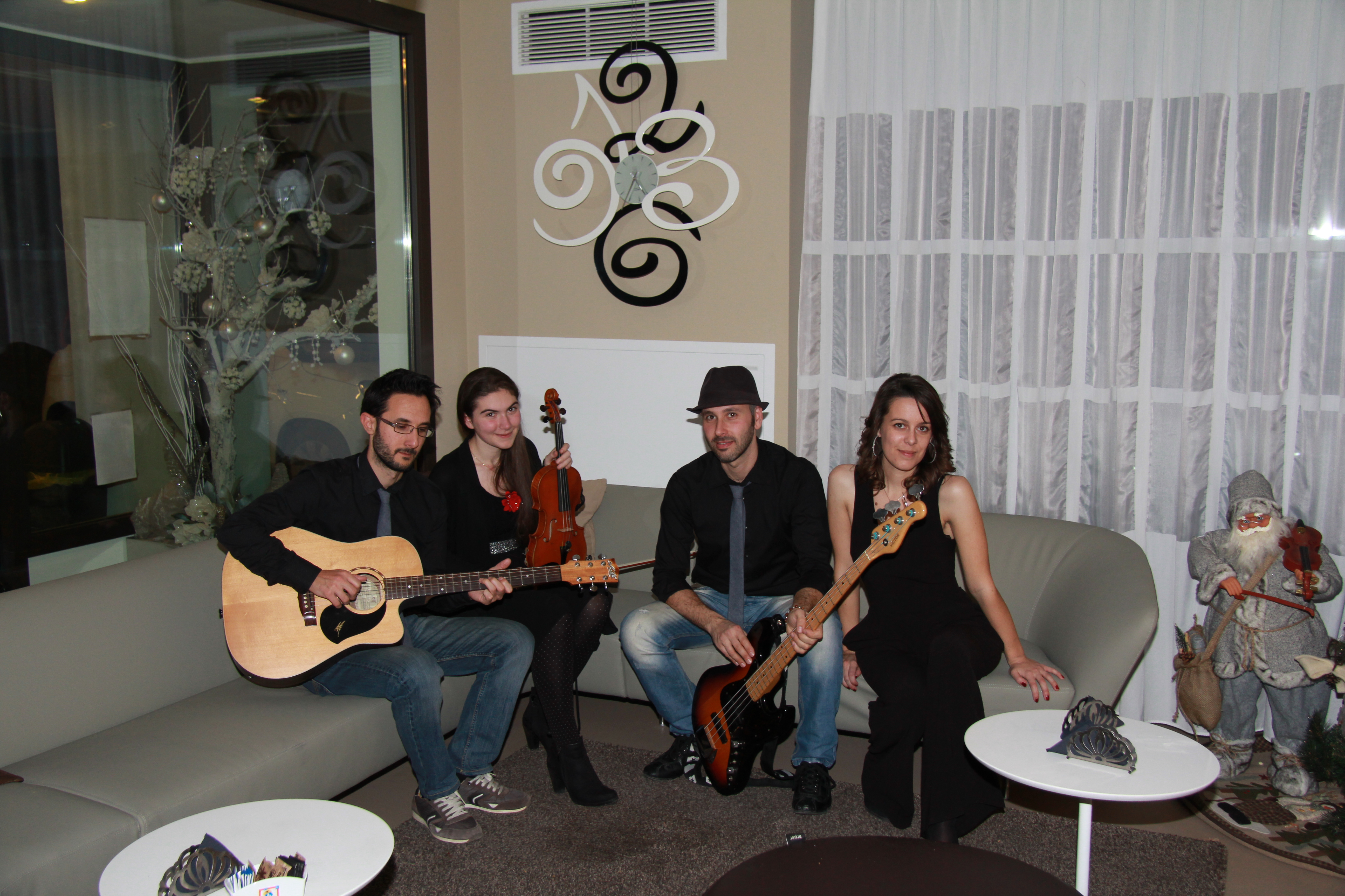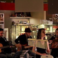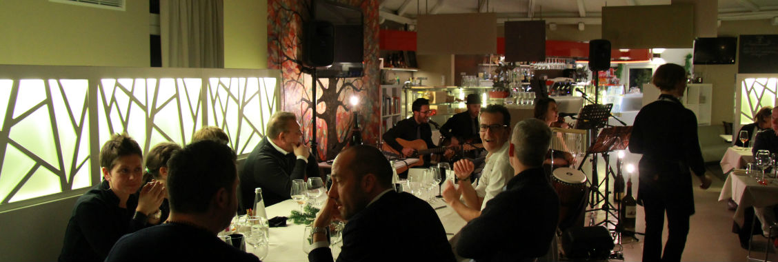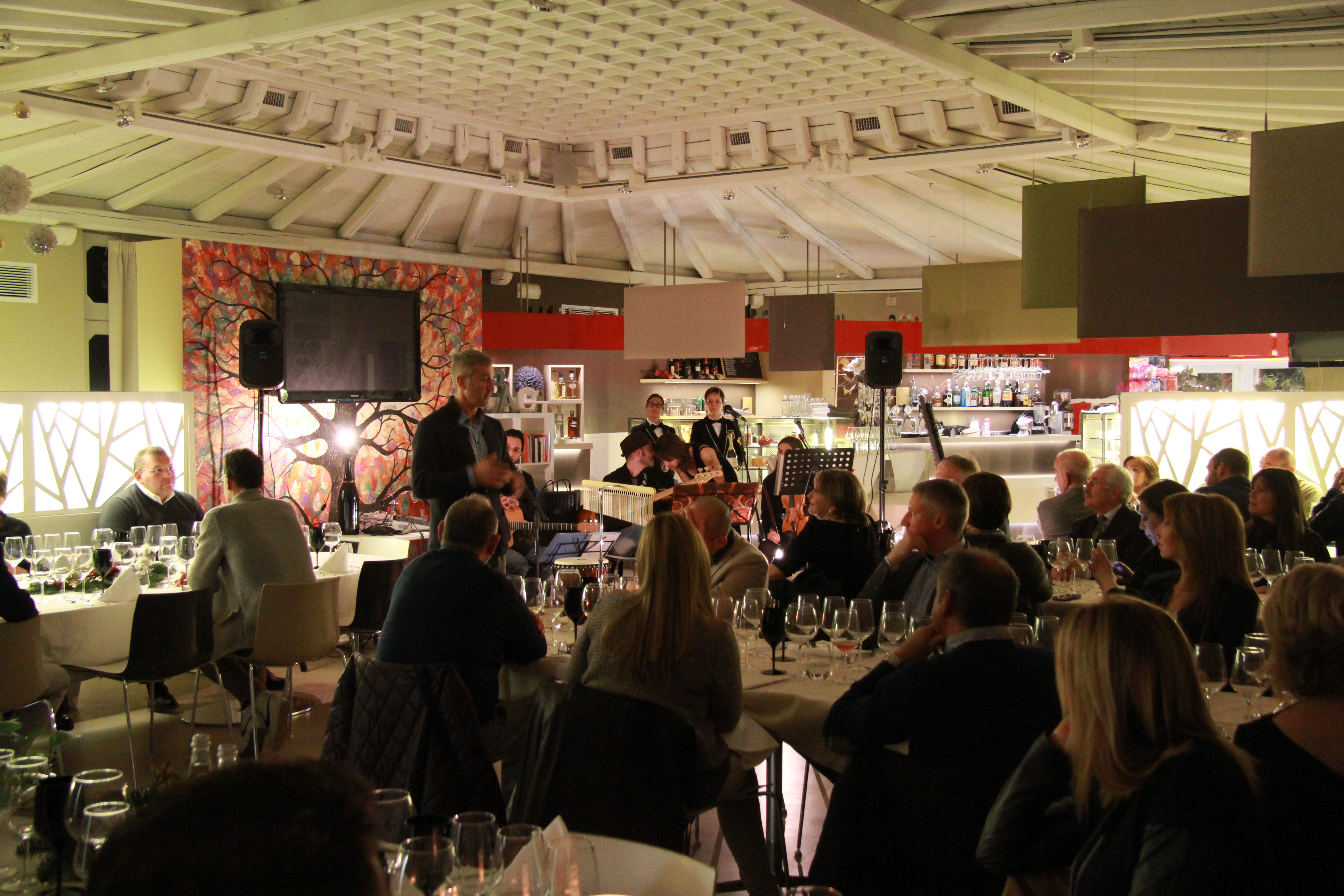 In una fredda sera di dicembre non potevamo trovare un posticino più caldo e accogliente, vicino al centro di Monastier. Design e dettagli curati dalla piccola zona bar alla sala ristorante, uno spazio intimo e moderno al tempo stesso. I lunghi tavoli elegantemente preparati ci danno l’ispirazione giusta per una serata all’insegna del cibo, del vino e della musica; l’arte sembra circondarci con gusto e semplicità. Una piccola lavagna attende, di fronte al tavolo del buffet e dell’aperitivo, per indirizzare gli ospiti, ciascuno al proprio tavolo. I primi vassoi generosi escono dalla cucina, con quei profumi di frittura che stuzzicano la fantasia di artisti e commensali. Aroma di nome e di fatto. Poi tutti prendono posto, le luci si abbassano, l’atmosfera soffusa si colora di un rosso vivo che emana dalle pareti. Strumenti e bicchieri alle mani. Inizia lo spettacolo.